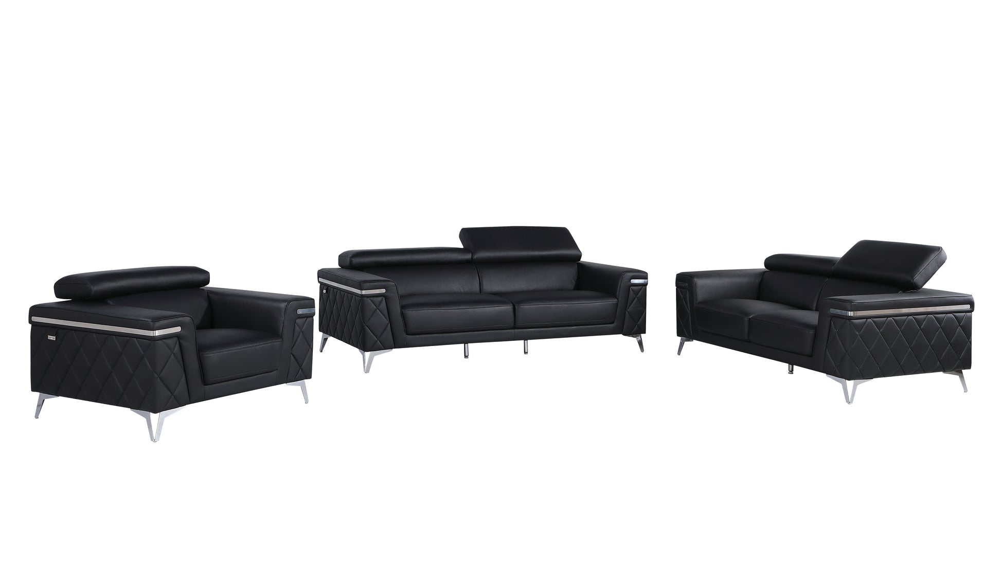 1140 - Top Grain Italian Leather 3 Piece Set - Black