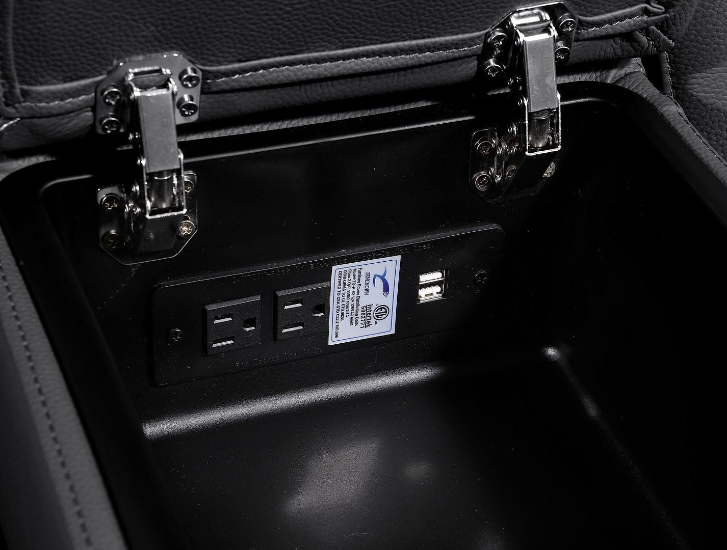 The integrated center console enhances convenience with deep storage, dual cupholders, wine glass holders, and an optional wireless phone charging pad—keeping everything from remotes to accessories neatly organized and within reach. In addition, there are hidden storage compartments on each side, offering deep storage space and built-in cupholders to keep essentials close at hand.