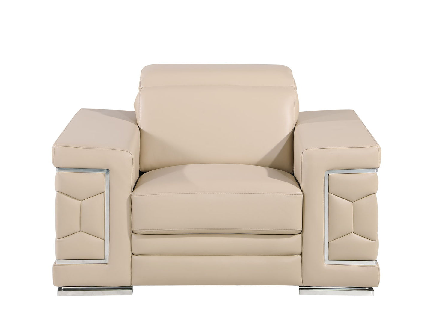 Exuding stylish form and comfort, this sofa set is inspired by modern and Italian design. The gorgeous, stainless steel chrome legs and trim add a beautiful contrast to the Italian Genuine leather upholstery. The cushions easily seat three people in optimal comfort, with the width of the armrests also offering a functional purpose as a perfect place for resting your favorite drink or a book. - Kiln-Dried hardwood frame with reinforced corner blocks - Soft-padded frame made with polyurethane foam wrapped in polyester fiber - 8-gauge sinuous spring construction - 3-layer high-density foam cushioning - Low profile solid stainless-steel leg Starting from the design to the finished product, each step of the production process is checked rigorously for quality. The selection of Genuine leather for the upholstering and solid Brazilian wood for the sofa frame is done with utmost respect for the finest raw materials.