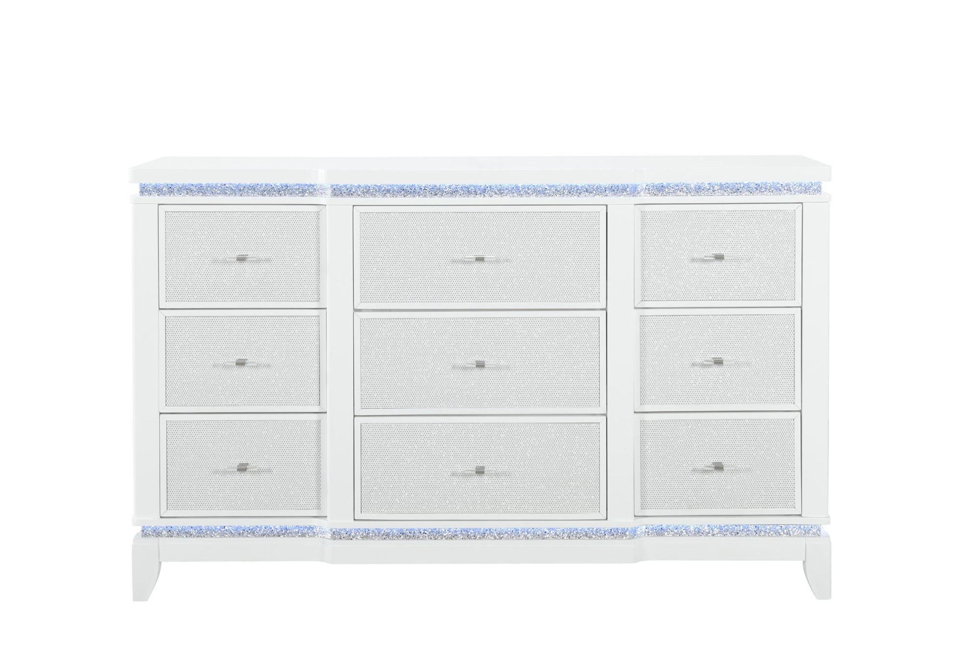 The Alina Dresser is an exquisite fusion of functionality and style. Its white finish harmonizes with LED-lit crushed glitter, while the perforated silver glam drawer fronts provide ample storage space that's as accessible as it is striking. Each pull is a statement of luxury, ensuring your storage solutions are never dull.