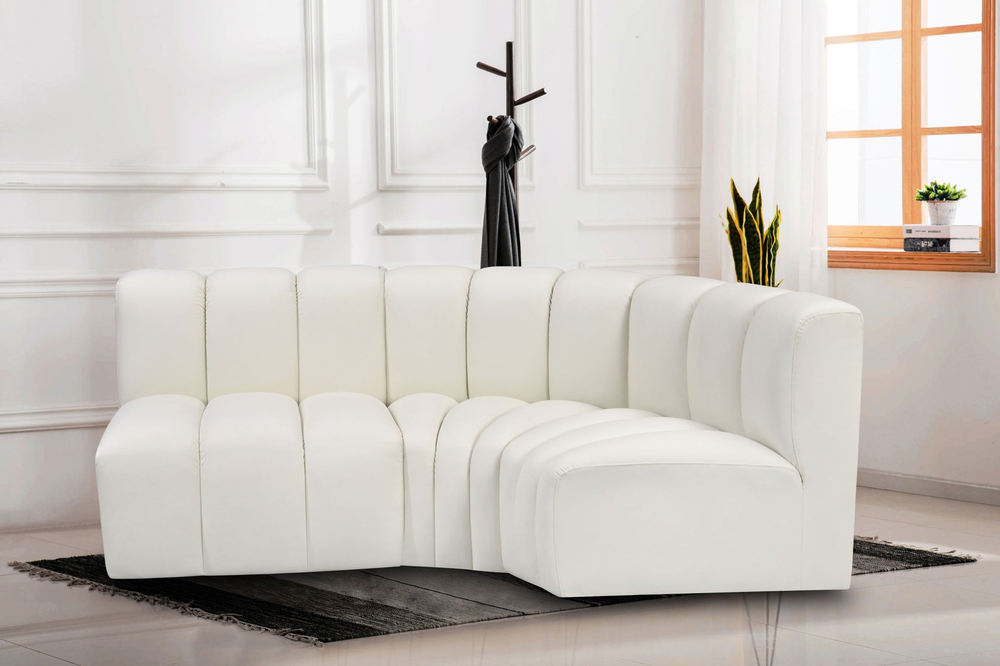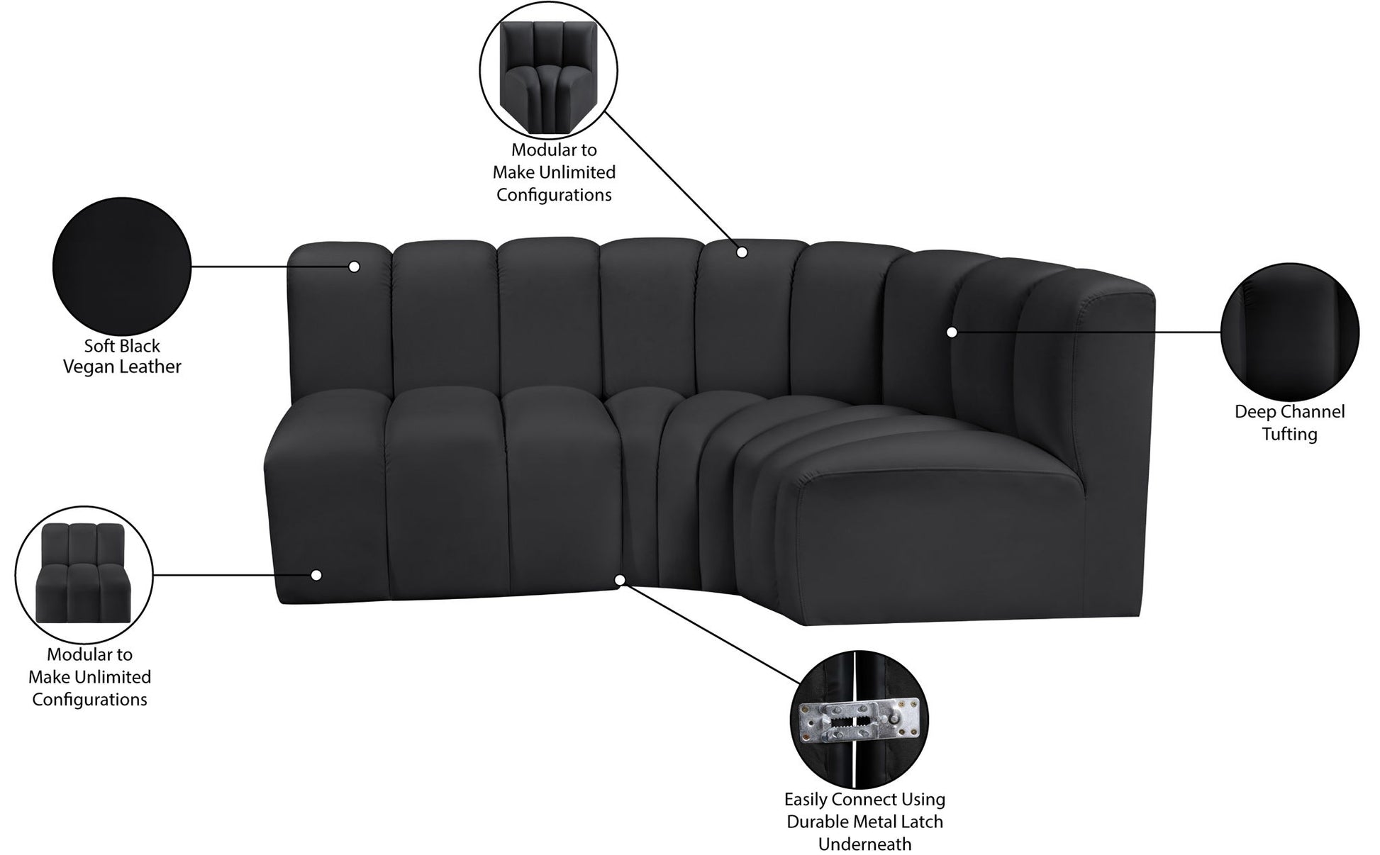 Unleash modern opulence with the Arc Vegan Leather Modular Sofa. Crafted for the modern connoisseur, this sofa injects an air of refined luxury into any space. Its sleek silhouette, upholstered in supple vegan leather, exudes timeless sophistication while the deep channel tufting adds textural intrigue, further elevating the chair's visual appeal. The modular design makes it a versatile chameleon, effortlessly adapting to your evolving needs and preferences. Whether you envision it gracing a chic living room corner, basking in the glow of a bedroom window, or adding a touch of drama to a home office, the Arc seamlessly complements your unique interior aesthetic.