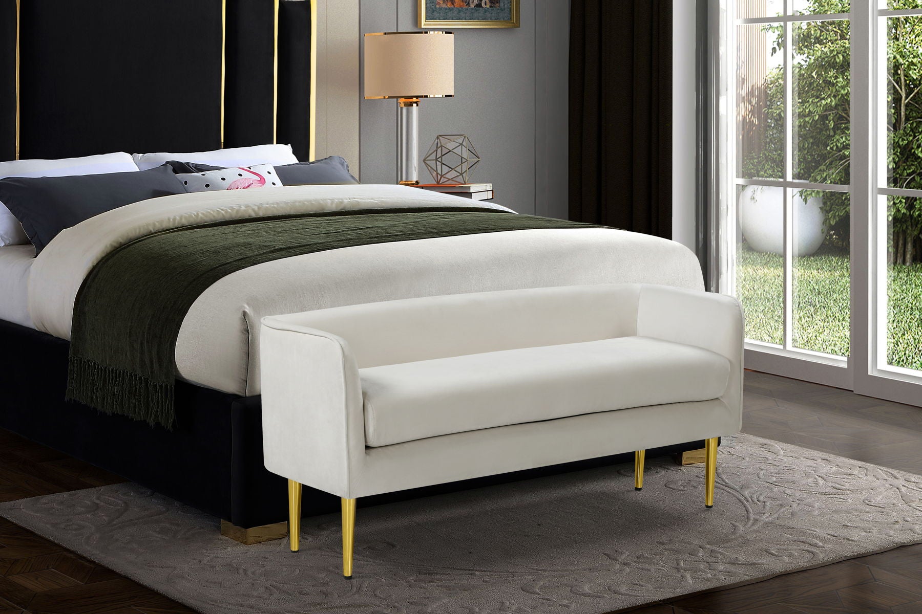 Sit or recline in exquisite comfort on this Audrey bench from Meridian Furniture. The velvet is smooth and soothing to touch, perfect for relaxing after a long day of activities. The contemporary design suits modern households while the 20-pound weight makes it easy to move around as needed. Sit the bench in the living room for extra seating or by the front door for putting on shoes.