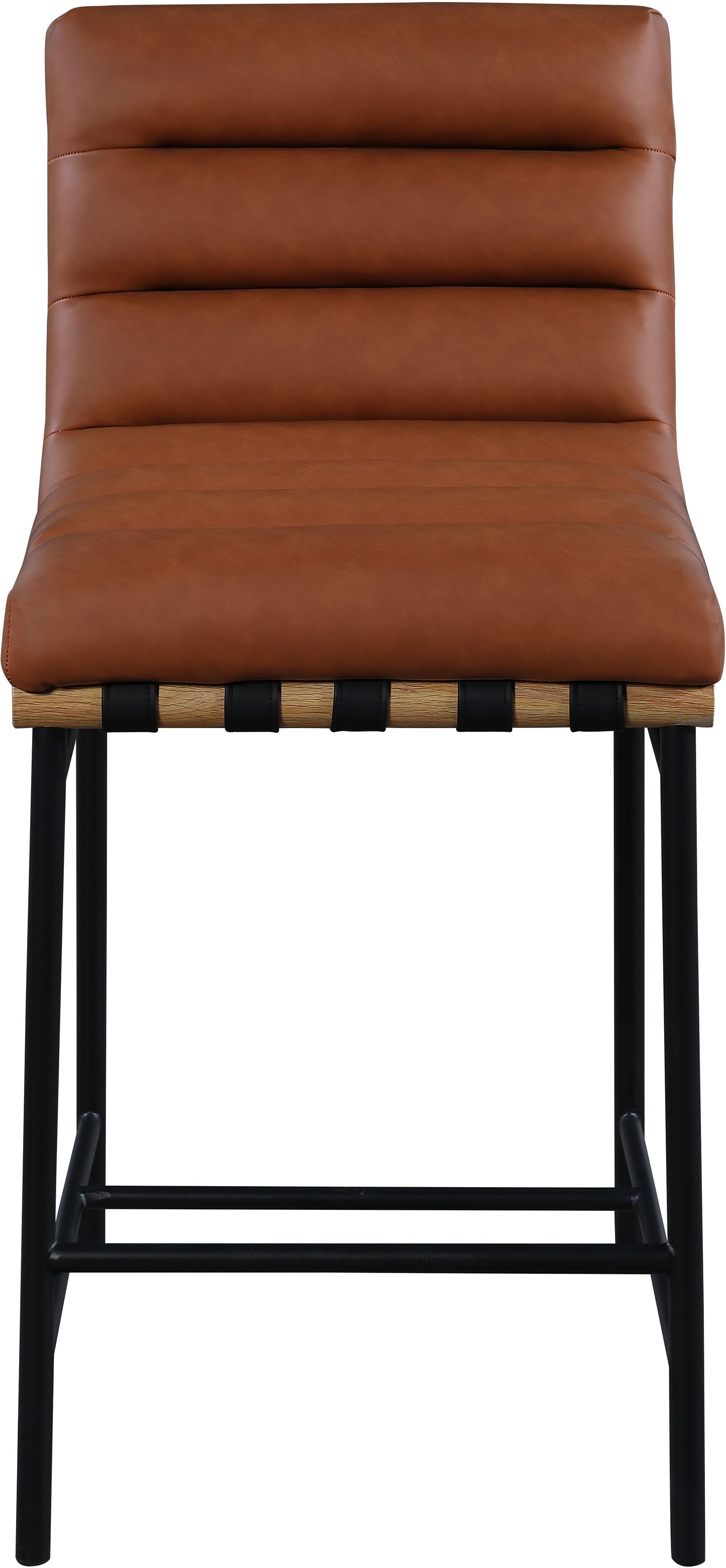 Kick back and relax with a drink in your hand with this Burke black faux leather counter stool. Featuring soft faux leather upholstery and faux leather straps, this counter stool is cozy and stylish. Its matte metal frame provides sturdy support so you can enjoy this stool for years to come. A white oak veneer metal dowel is tucked firmly in place beneath the front of the stool, providing extra support and added style.