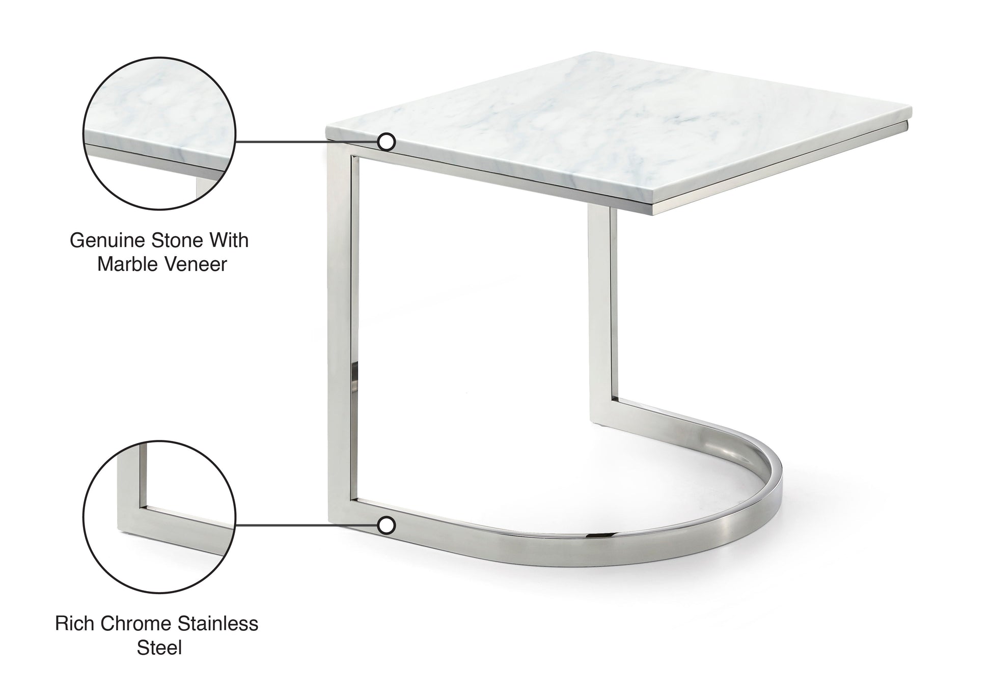Lend your living room or den a modern slant with the Copley end table from Meridian Furniture. This end table features geometric bases, and a sleek chrome finish that gives your space a bold, up-to-the-minute look. Each table has a solid stone top for durability and style.