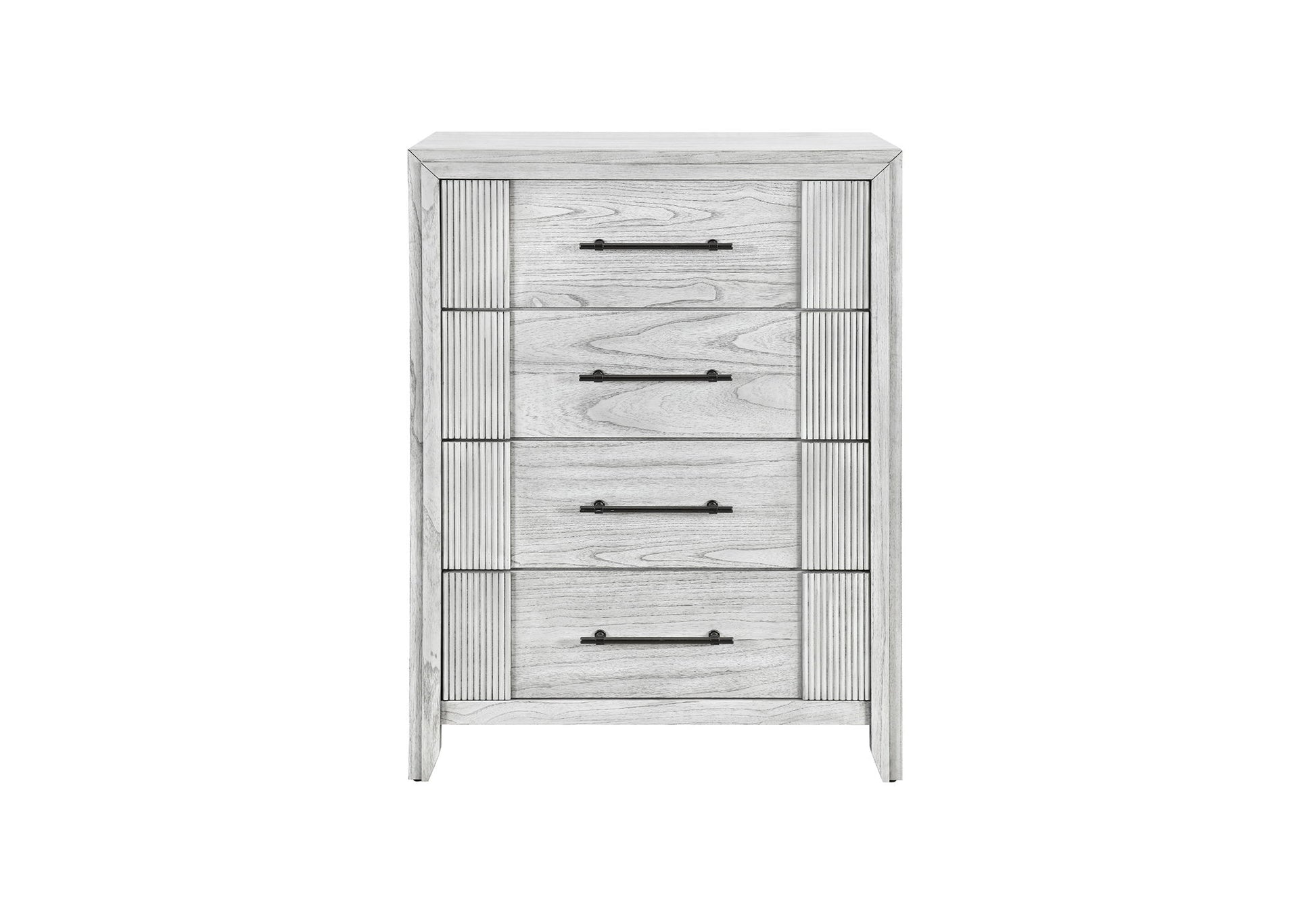 Maximize your storage without compromising on style with the Elsie Chest. Featuring 4 spacious drawers with fluted textures and dark handles, this piece combines modern design with practicality. The grey wash veneer finish ties the look together, making it a versatile addition to your bedroom suite.
