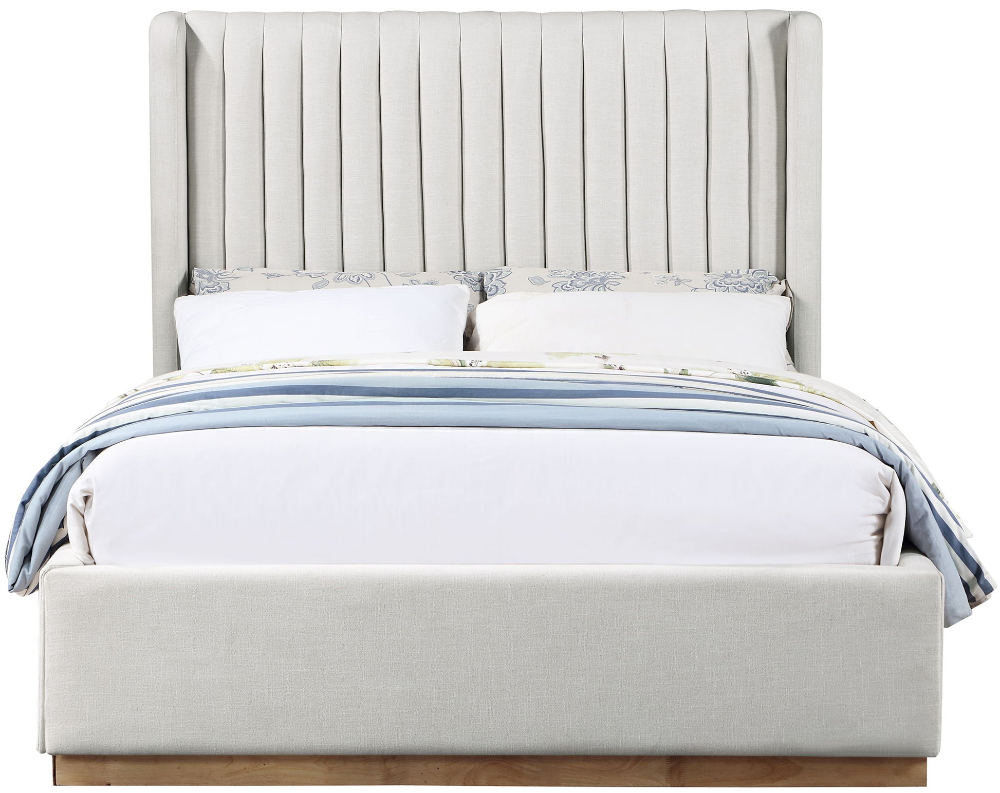 Nestle you (or the two of you) into the welcoming confines of this Logan linen textured fabric bed. This handsome bed features a super tall headboard that's channel tufted for extra softness and support against your back while you catch up on your reading or watch TV in bed. Soft rich beige linen fabric covers the back and sides of this wingback bed, giving it an ultra modern feel. A solid finished wood base provides ample support for lasting performance and durability.