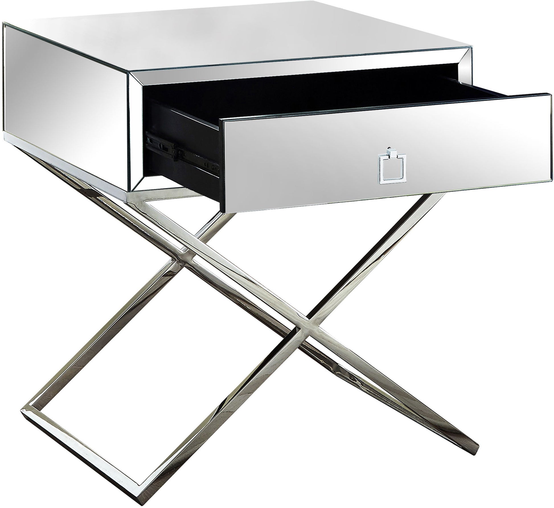 Get organized while keeping your room's details on point with this Lynn mirrored side table. This pretty side table features a single drawer for holding everything from remotes to reading material. The X-style legs add a modern aesthetic, and their chromed finish adds sparkle and shine to the design. A mirrored finish completes the look, ensuring this table fits well in modern decor themes.