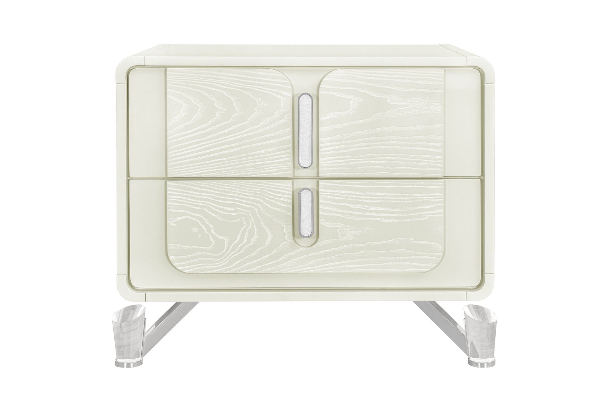 The Lyra Nightstand is a perfect balance of function and refinement. Resting on acrylic legs and finished in light beige wood, it features full-extension, felt-lined drawers accented with oval metal handles. A built-in USB port adds modern convenience, making it as practical as it is beautiful.