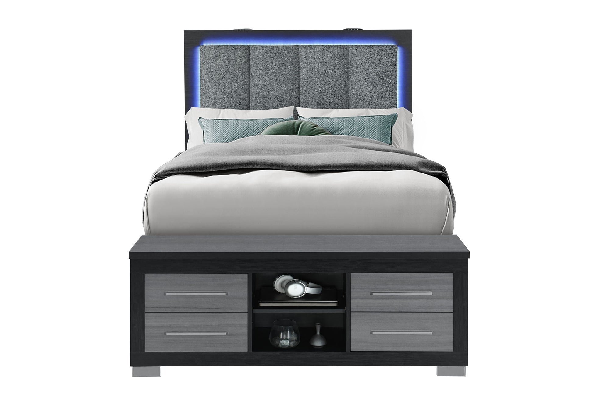 Elevate your bedroom with the Madison Queen Bed, where contemporary design meets ultimate functionality. The headboard features gray upholstery, an integrated LED light, and a USB charging port to keep your devices powered. Two built-in speakers deliver quality sound, creating a relaxing ambiance. Ingenious storage cubbies on each side of the headboard, provide space for books, devices, or decor. Designed for practicality, the bed offers all-around storage, ensuring you have ample room for all your bedroom essentials. The sleek black and gray finish adds a sophisticated touch to this versatile centerpiece.