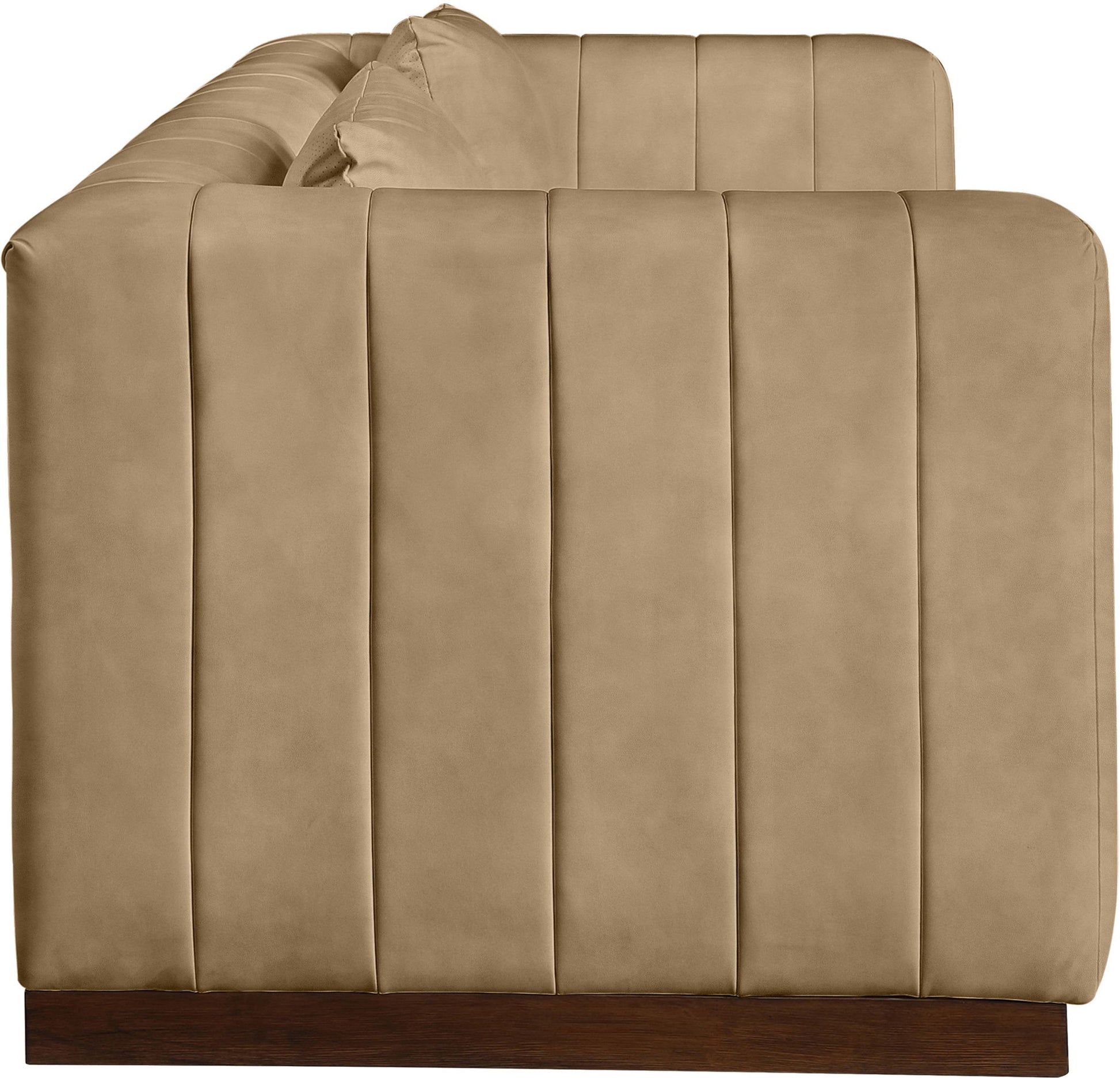 A minimalist masterpiece, the Mallina tan vegan leather sofa combines form and function for a modern and stylish look. Its classic design and rich leather upholstery make it a sophisticated statement piece that will never go out of style. The clean lines, paired with a brown walnut finished base, create a sophisticated and inviting atmosphere.