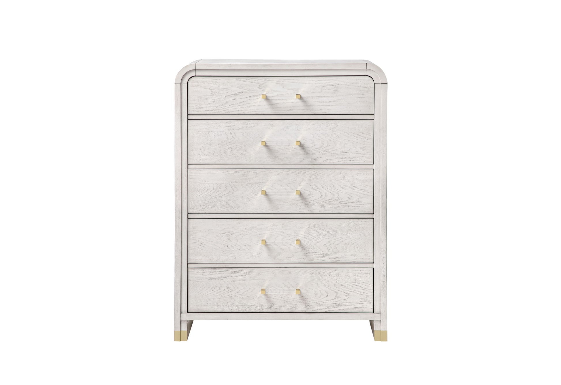 The Malmo Chest provides ample storage with five spacious drawers designed for smooth operation and everyday use. Its light beige oak veneer, rounded edges, and gold-accented acrylic handles reflect the collection'' s modern luxury. Gold trim at the legs completes the look, making this chest a striking yet practical addition to your bedroom suite.