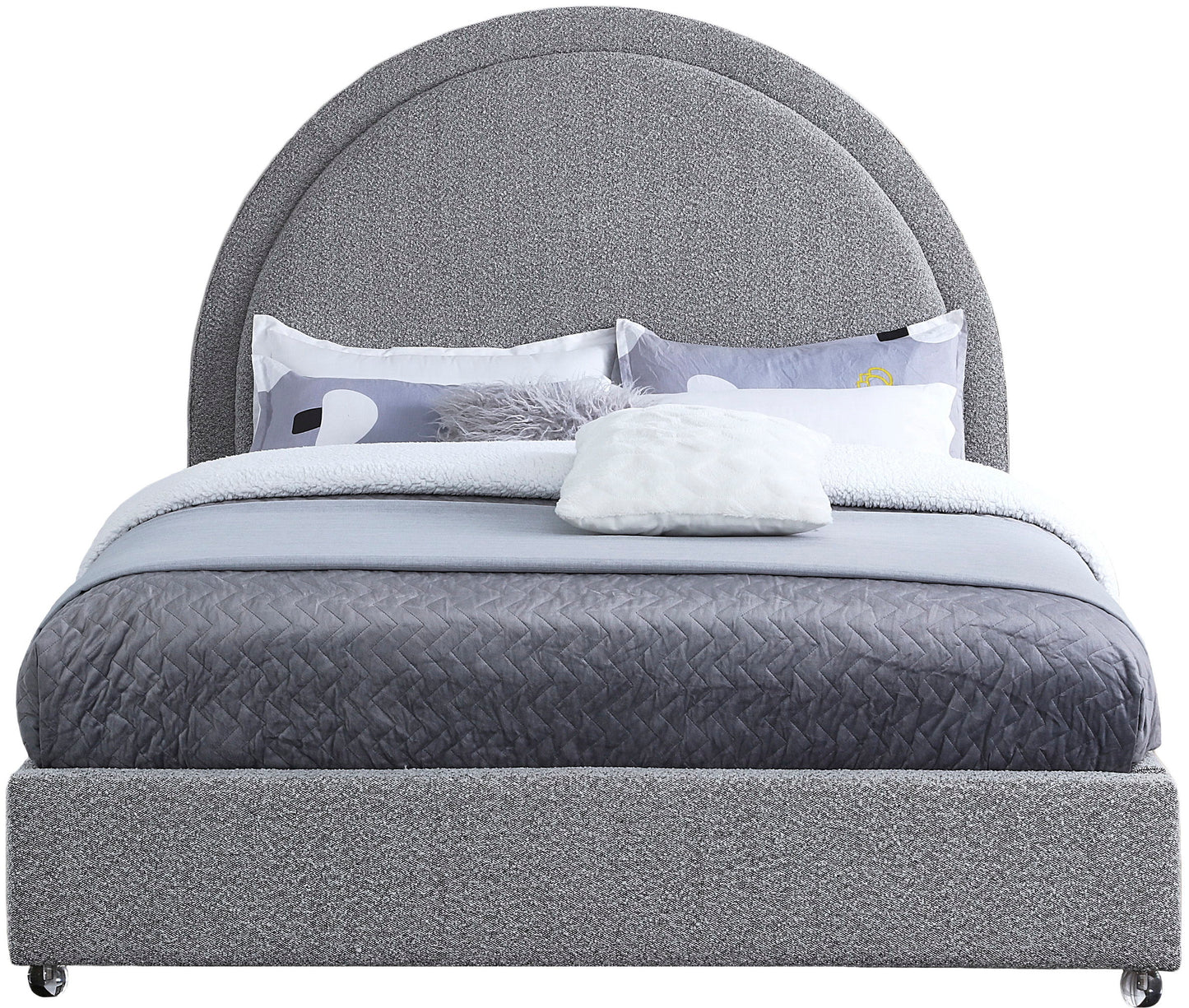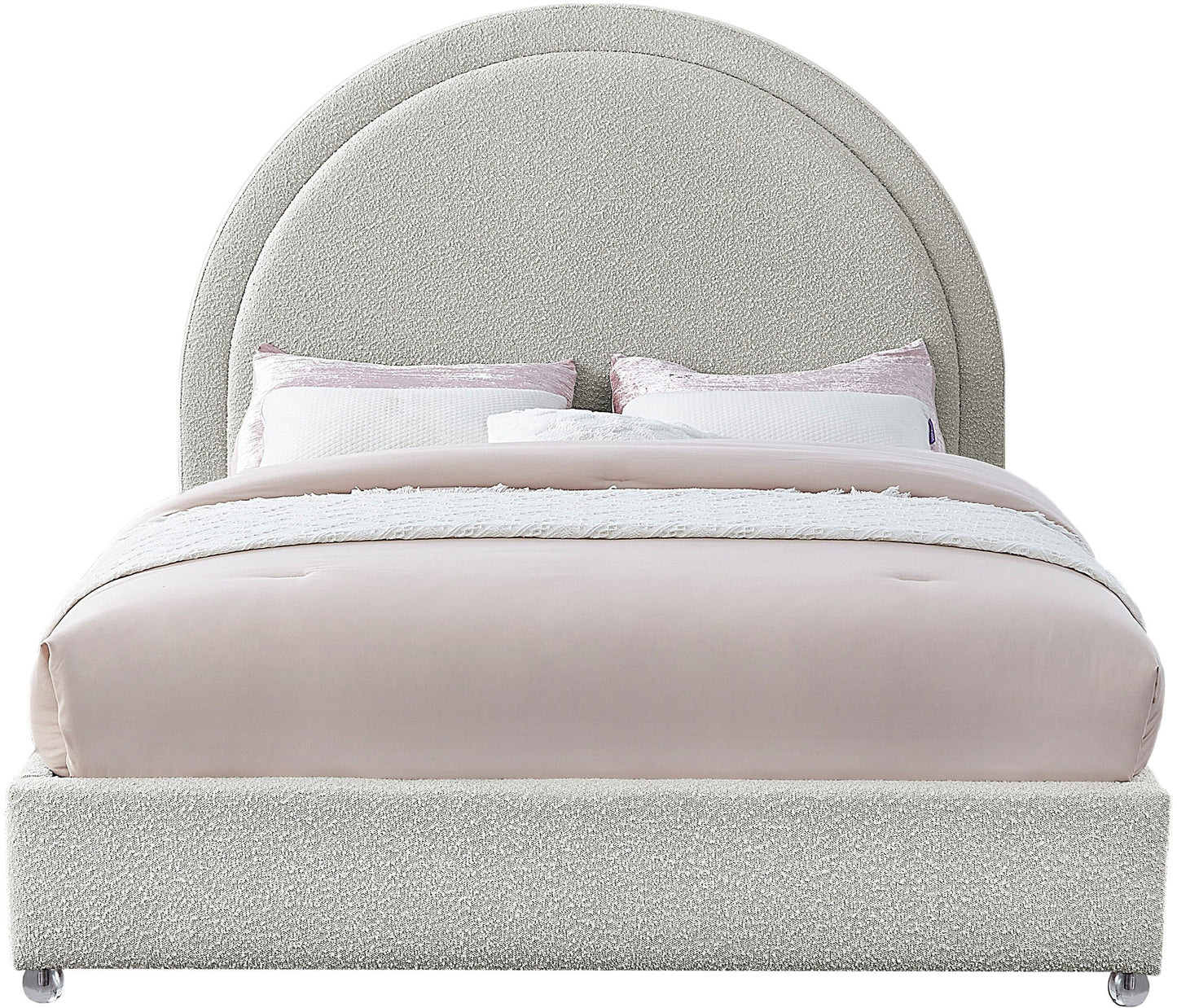 Get ready for compliments when you add this Milo boucle fabric bed to your space. It's upholstered head to foot in rich boucle fabric, so it's soft to the touch and regal to the eye. The star of the show is the bed's rounded headboard, which stretches out tall above you for a look that oozes regality and sophisticated charm. Acrylic legs give the bed a somewhat modern finish.