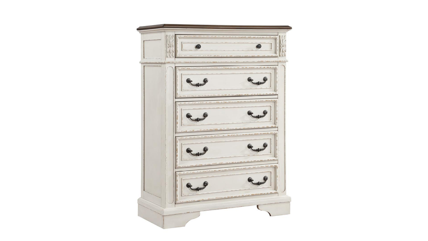 Elevating the art of traditional cottage styling, the Realyn chest of drawers is your dream bedroom retreat realized. Antiqued two-tone finish blends a heavily distressed chipped white with a natural wood tone top for added charm. Framed drawer fronts and decorative corbels add refinement, while bail pulls in a dark bronze-tone finish lend a classic touch.