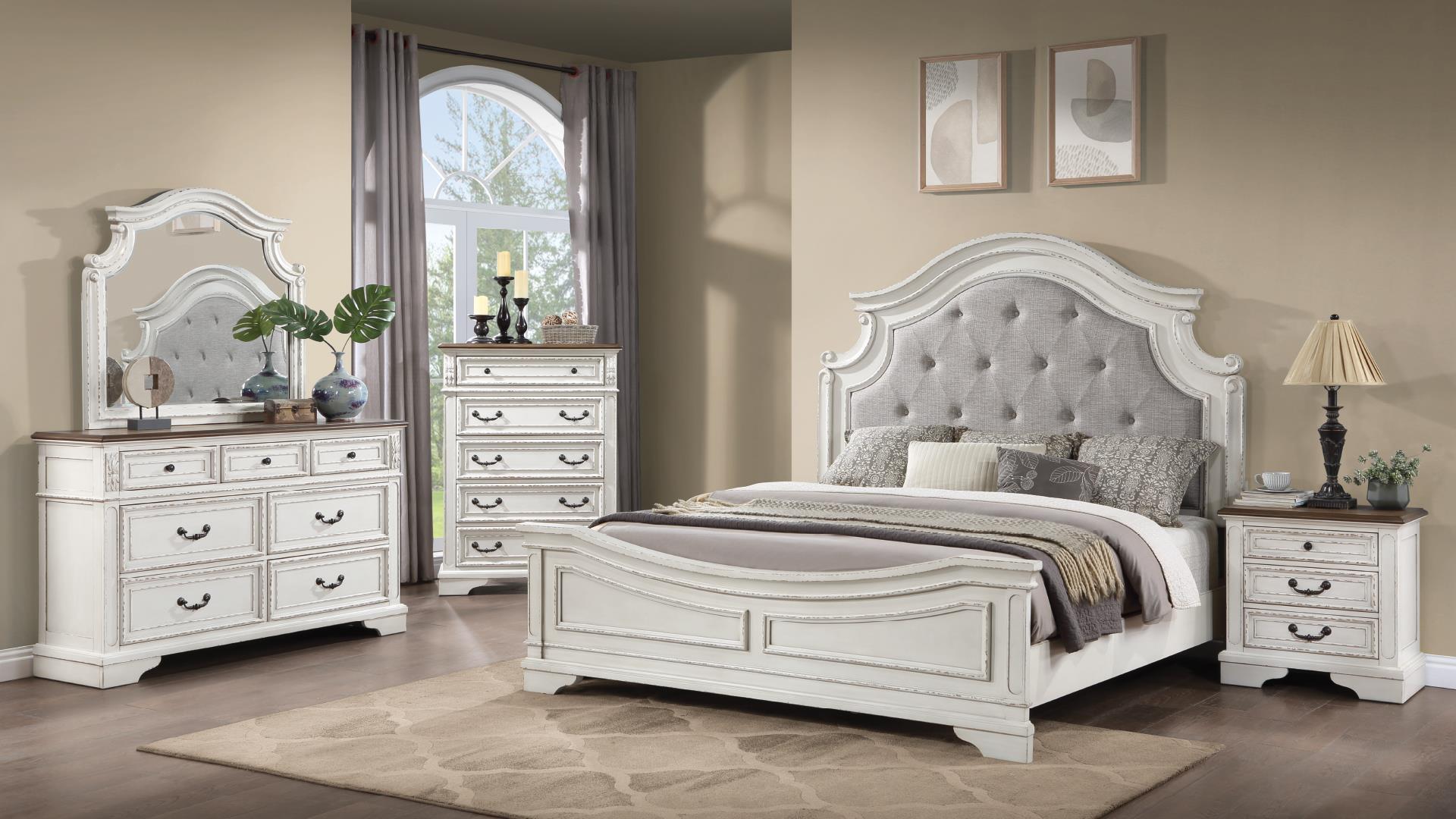 This magnificent Bedroom Set is crafted and inspired by the luxurious designs of the romantic era. The time is renowned for sophistication, glamor, and spectacular luxury. This set is exclusively designed and filled with a romantic spirit. The gorgeous bed features a stunning upholstered padded headboard and low profile upholstered padded footboard in a White finish. Expertly detailed, this gorgeous bed features a beautiful button-tufted headboard and footboard with elaborate design and sparkling mirror trim accents. This mirror inlay trimming on each furniture piece's edges creates a dazzling glow for your master bedroom. Expertly detailed, the case goods are also crafted with elements combining a hint of modern yet traditional-looking accents with a matching finish. Provide style and storage to your sleeping area decor with these fabulous King Bed, 1 nightstand, dressers & mirrors. Drawers in these case goods provide spacious storage for your personal stuff and other essentials, making it a functional home companion. This fabulous bedroom collection allows you to sleep like royalty and enjoy your leisure each night. Superb dreamlike in style, instantly transforming bedroom interiors. Wait no more; transform your bedroom into a glamorous boudoir with this bedroom set.