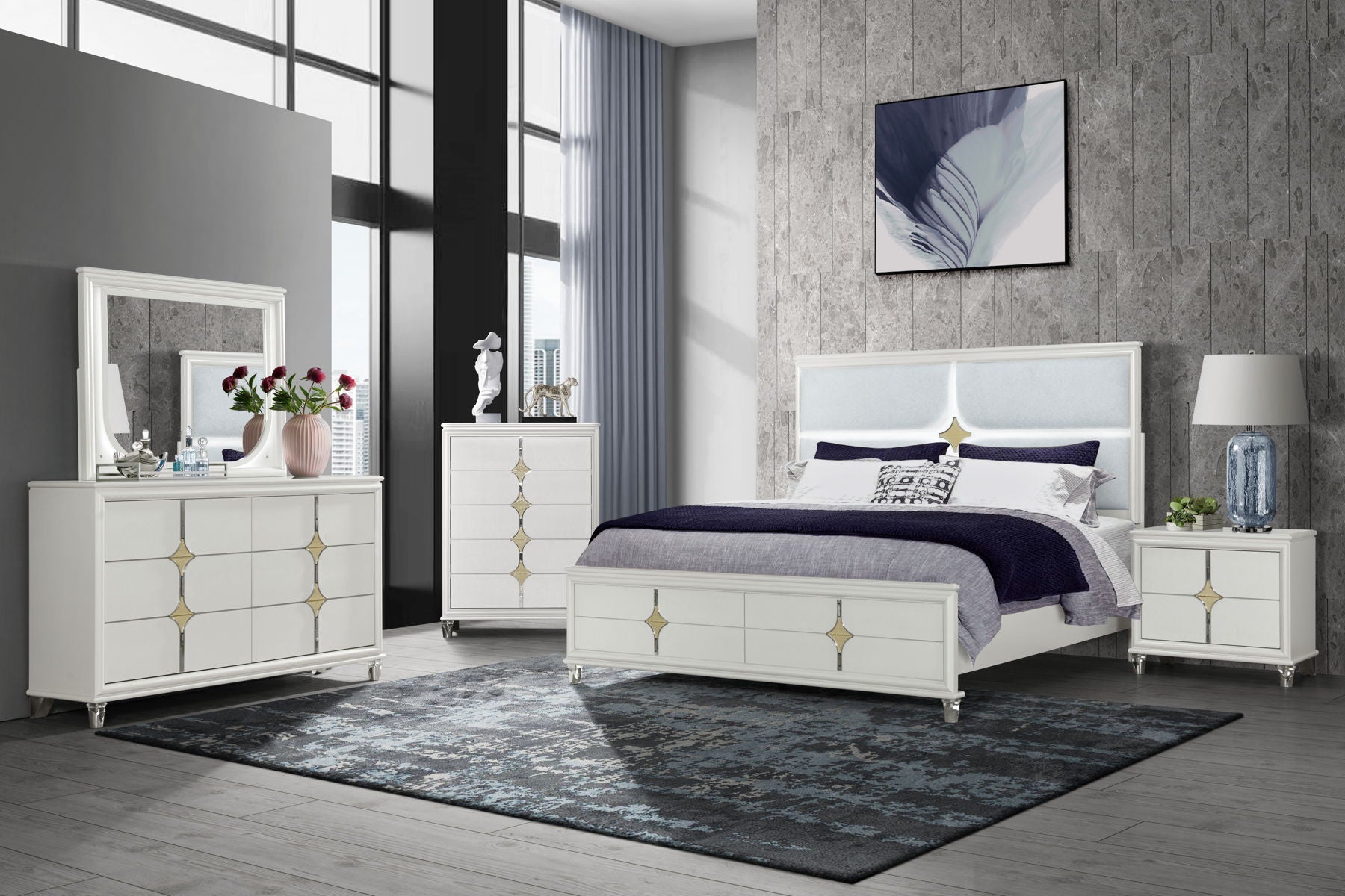 The Orion Bedroom Collection, a stunning blend of modern design and luxurious details. Finished in a sleek white, each piece in this collection features textured drawer fronts and hidden drawer pulls, complemented by elegant gold accents and acrylic legs. The collection's standout features include LED accent lighting on both the bed's upholstered headboard and the mirror. With its contemporary aesthetic and sophisticated touches, the Orion Bedroom Collection is truly a showstopper.