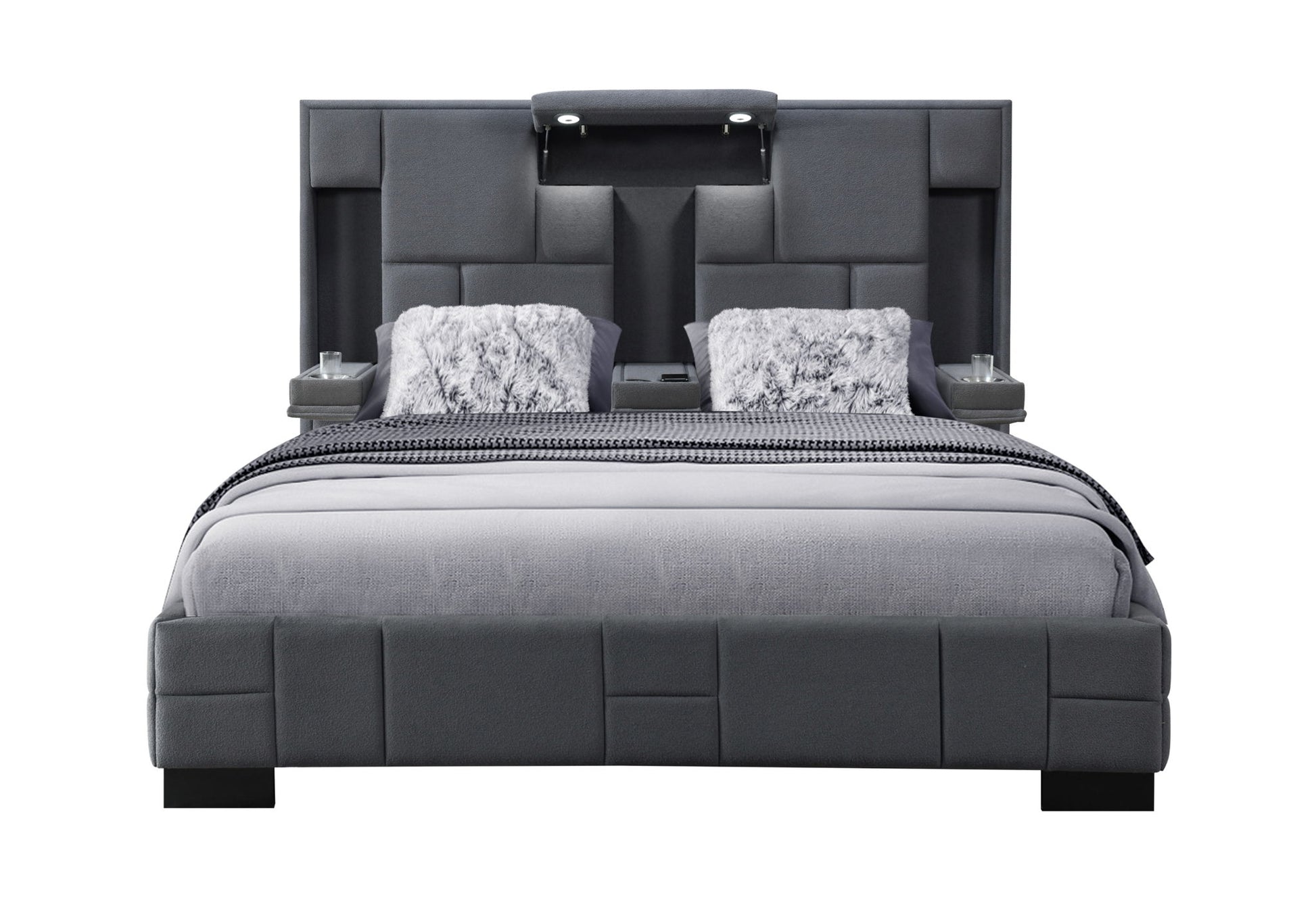 Elevate your bedroom with the sophisticated Oscar Bed by Global Furniture USA, available in a refined palette of dark grey, light grey, and navy blue. This unique bed is the epitome of modern luxury and convenience, designed to cater to the needs of tech-savvy individuals who appreciate comfort and style. The Oscar Bed boasts innovative features that set it apart from the ordinary. Each side includes fold-down armrests, offering adaptable comfort for reading or relaxing in bed. The central armrest serves as more than just a plush support; it houses a built-in wireless charging station, ensuring your devices are powered up without the clutter of cords. Additionally, LED reading lights are thoughtfully integrated for late-night readers, providing optimal illumination without disturbing your partner. The headboard is not just a statement piece but also an entertainment hub, with built-in speakers that envelop you in rich, immersive sound. Whether you're unwinding with your favorite tunes or catching up on audiobooks, the Oscar Bed transforms your resting space into a personal sanctuary. Crafted with an eye for detail and a commitment to quality, the Oscar Bed by Global Furniture USA is the ultimate indulgence for those who seek unparalleled comfort and a touch of modern tech in their bedroom retreat. has context menu