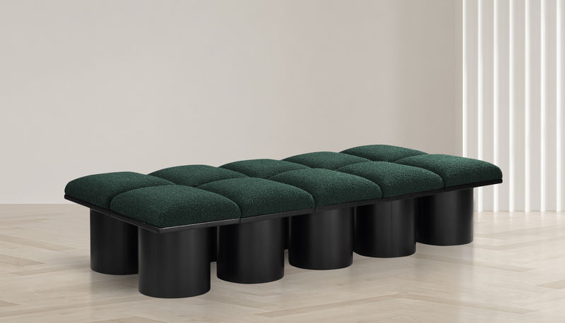 Bring valuable seating and remarkable style to your space with this Pavilion Boucle Fabric Bench, an exquisite balance of style and usability for the entryway, bedroom, and beyond. Crafted from oak veneer with a black finish, this bench has a 4-inch-thick seat cushion that's channel-tufted for a touch of luxury. The bench's columnar bases add a dash of Art Deco design, making it a captivating focal point in any room.