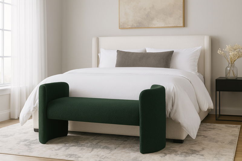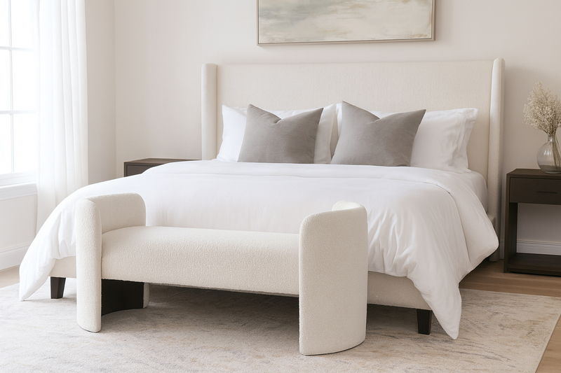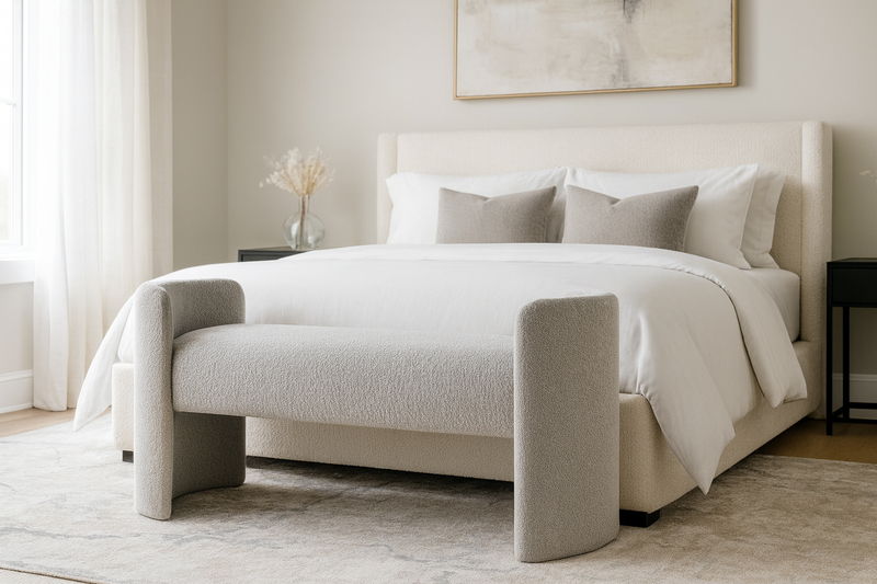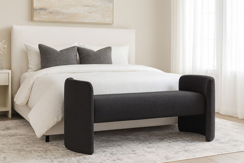 Place this Peyton Boucle Fabric Bench wherever you need an additional seat and a stylish and chic element added to your room. This pretty bench is just the thing to position at the end of a bed or in a foyer or entryway to provide a spot to sit while putting on shoes or pulling on boots. The rounded arms and the nonassuming style lend this bench an air of contemporary panache while the rich boucle fabric lets it easily mesh with your room's color scheme.