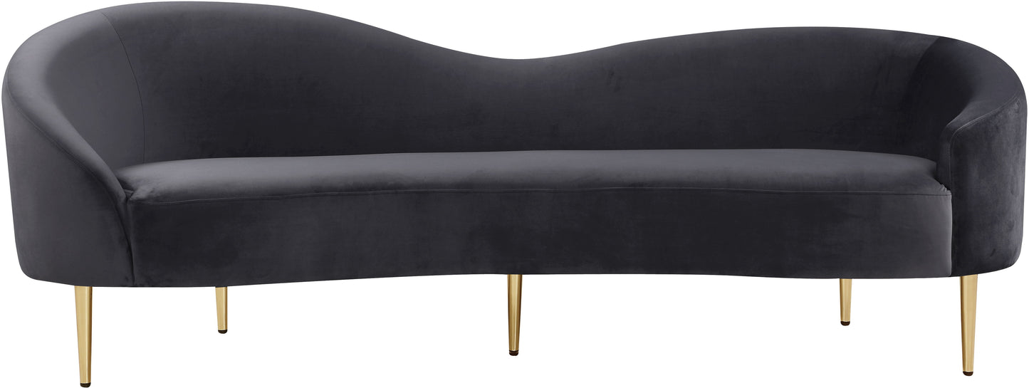 Get comfy while remaining chic in this elegant Ritz velvet sofa. Plush-colored upholstery provides a soft texture that is pleasing to the senses, while its curved design offers a contemporary touch to your home furnishing. metal legs complement the sofa's sophisticated color, creating a gallant piece anyone would be proud to display in their home.