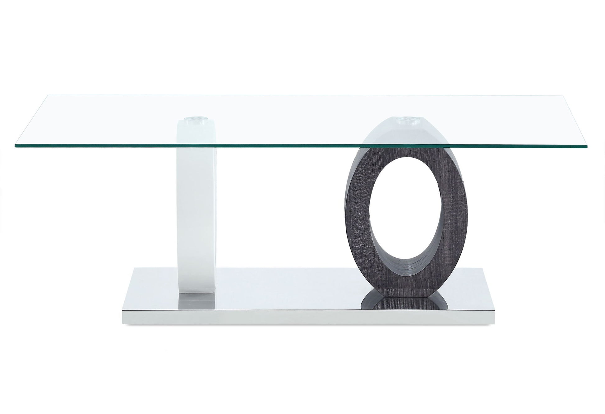 Unique design and modern appeal are the highlights of this dynamic and functional occasional table. From the gleaming Glass Top, to the sleek silver-toned base, this table will become the visual focal point in any room setting and will transform your seating/entertainment area from basic to wow! Striking two-toned dual oval base of grey and white make this table easy to coordinate decor and provides many decorating possibilities. The lovely glass top is generously proportioned, making this table great for entertaining or display. Quality craftsmanship in all facets of production ensures durability and long-lasting wear. Inspired design elements and versatile function make this table a must have piece for your home and will provide you with years of enjoyment and usefulness.