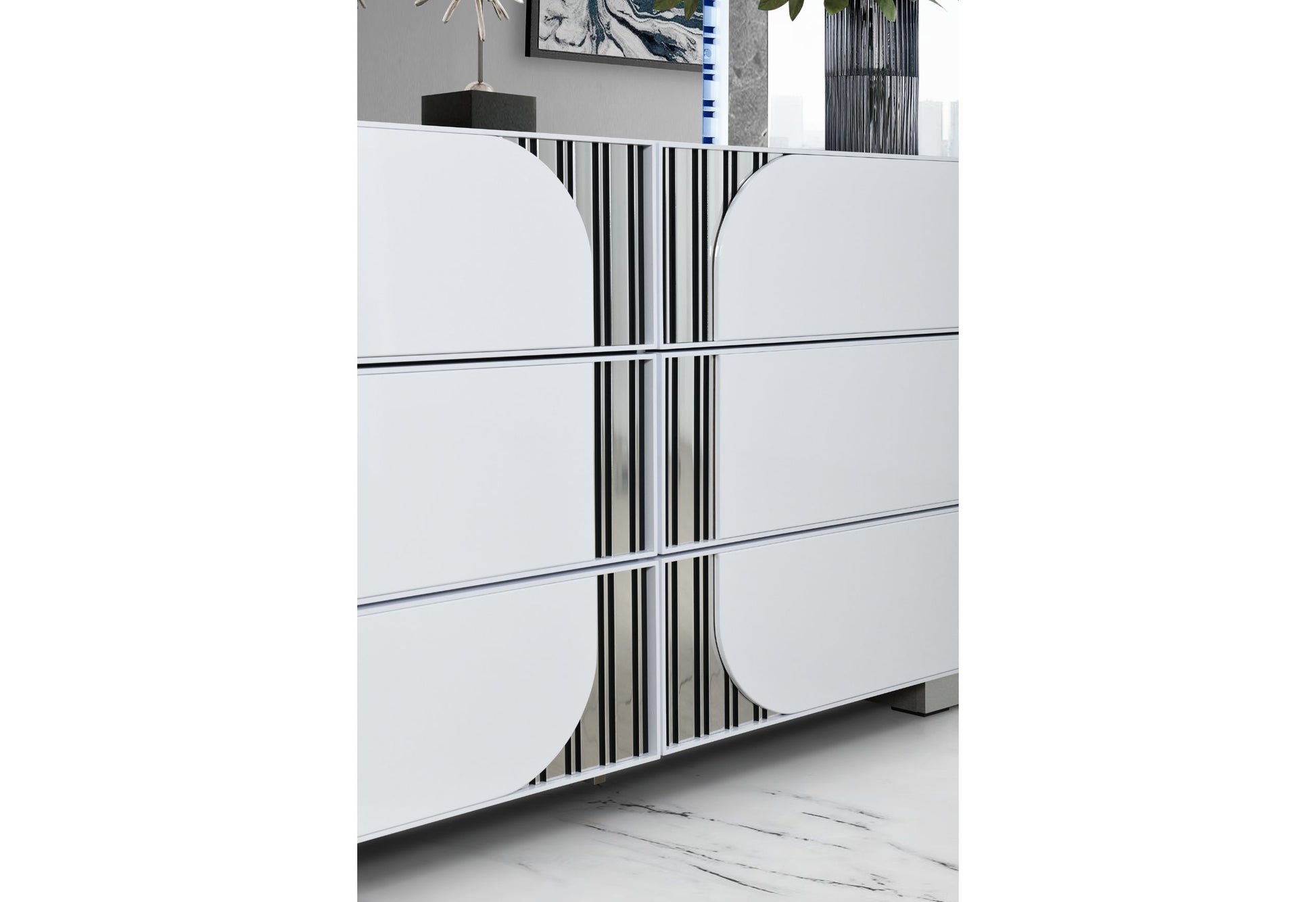 The Talia Dresser offers ample storage with its textured drawer fronts, making it both practical and stylish. Finished in a sleek white with chrome accents, it complements any modern bedroom decor.