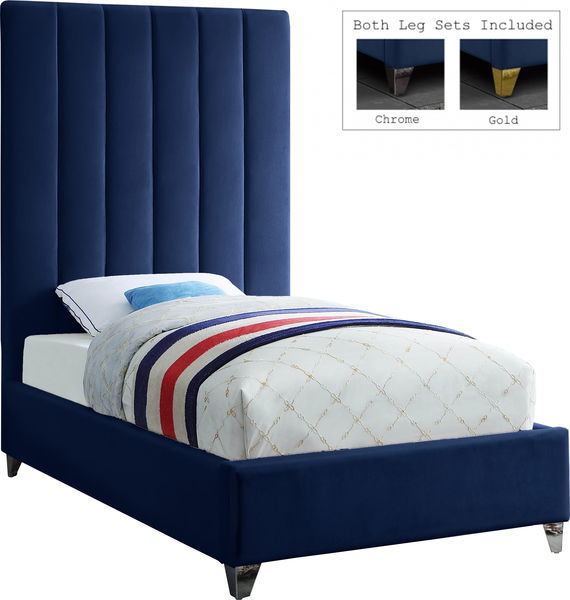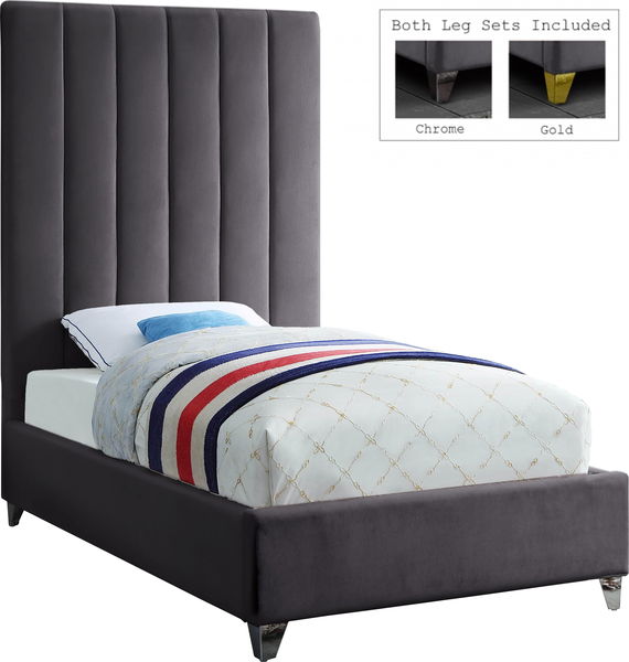 Take the look of your bedroom to new decorative heights with this ultra-modern Via upholstered bed. Sleek velvet upholstery gives this bed a true upscale feel and epitomizes fine living while channel tufting along the headboard keeps the padded material inside plump and aloft, so it cradles your body while you sit up in bed to watch TV or read. Metal legs bring this platform bed up off the floor, allowing clearance below for cleaning and adding to its svelte contemporary profile.